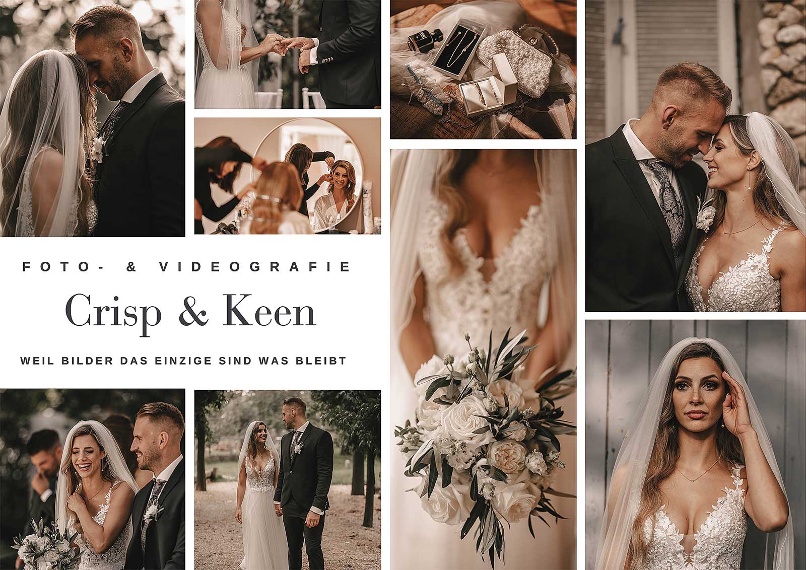 Kevin arbeitet seit mehr als 10 Jahren als Foto- und Videograf in der Hochzeitsbranche. Seit 2020 führt er hauptberuflich „Crisp & Keen“. An seiner Seite ist Larissa als Fotografin mit ihm unterwegs. Wohnhaft im schönen Fröndenberg an der Ruhr leben wir gemeinsam mit unserem Australian Shepherd „Henry“ in einer kleinen Haushälfte. Über die Jahre haben wir ein starkes Netzwerk aus talentierten Kollegen aufgebaut, um für Projekte jeder Größe bestens gerüstet zu sein. Wir leben eine offene und freundschaftliche Art zu unseren Paaren und sind gerne von Minute eins an mit ihnen per Du.