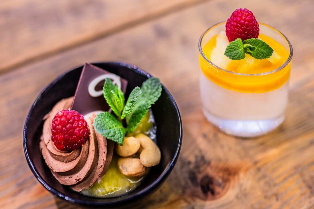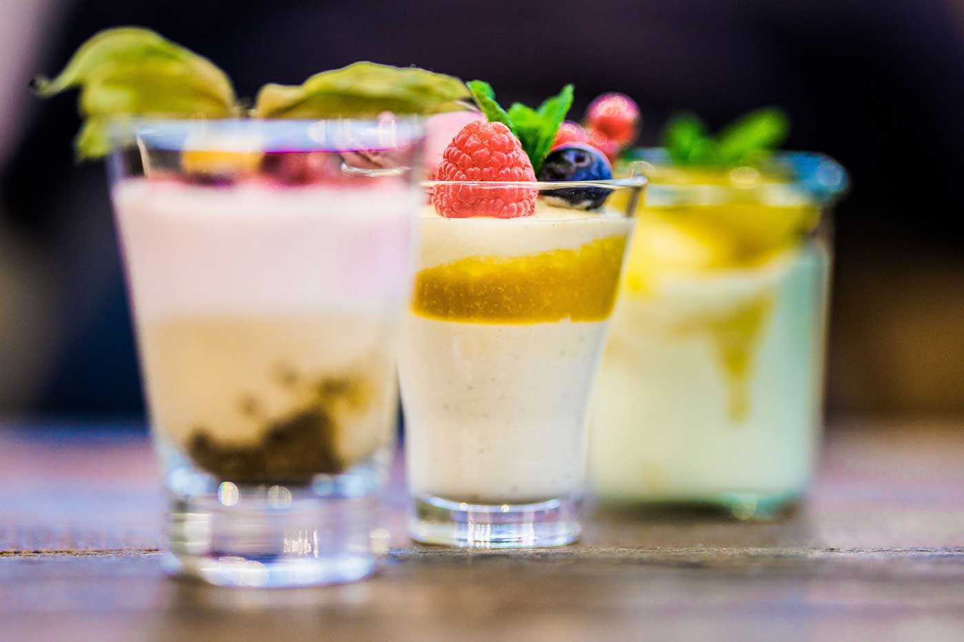 Verschiedenste Dessertvariationen werden auf natürliche Weise und täglich frisch zubereitet. Die Hingabe und Liebe zum Detail sowie die Auswahl feinster Rohprodukte lassen jede Dessertkreation zu einem optischen Feuerwerk werden. Mousse au Chocolat aus geschmolzener Belgischer Edelschokolade und frischer Sahne, erfrischende Fruchtdesserts aus frisch püriertem Obst und Fruchtmark, intensiver Vanillegeschmack aus hochwertigen Tonkabohnen. Wir verzichten auf Kakaopulver und Fertigmischungen.