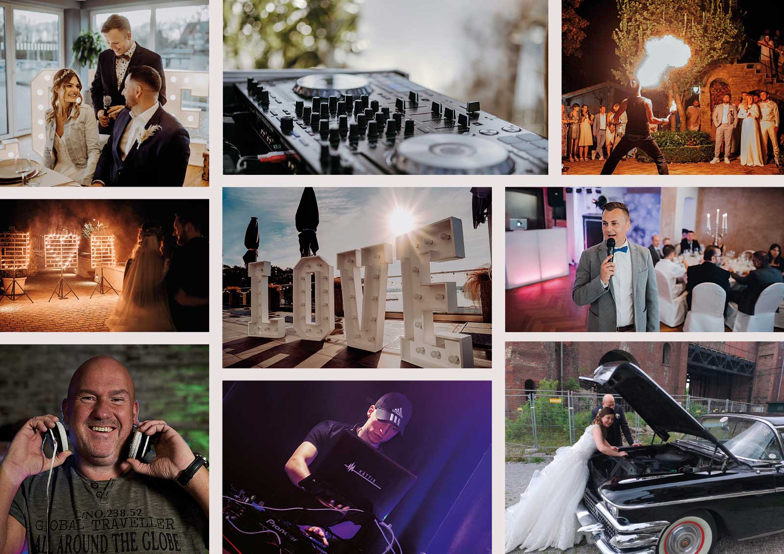 - Alles an Technik die ihr braucht, von Tonanlagen bis Lichtanlagen mit coolen Effekten, werden mitgebracht – einfach ein Rund-um-Service für Euren Großen Tag..