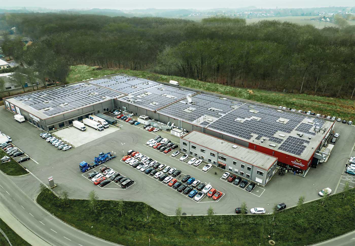 Die Energie für das Stolzenhoff Unternehmen liefert inzwischen zu 75 Prozent eine Photovoltaik-Anlage. Mit 1,8 Megawatt und 4000 Solarzellen wird pure Sonnenenergie gespeist.