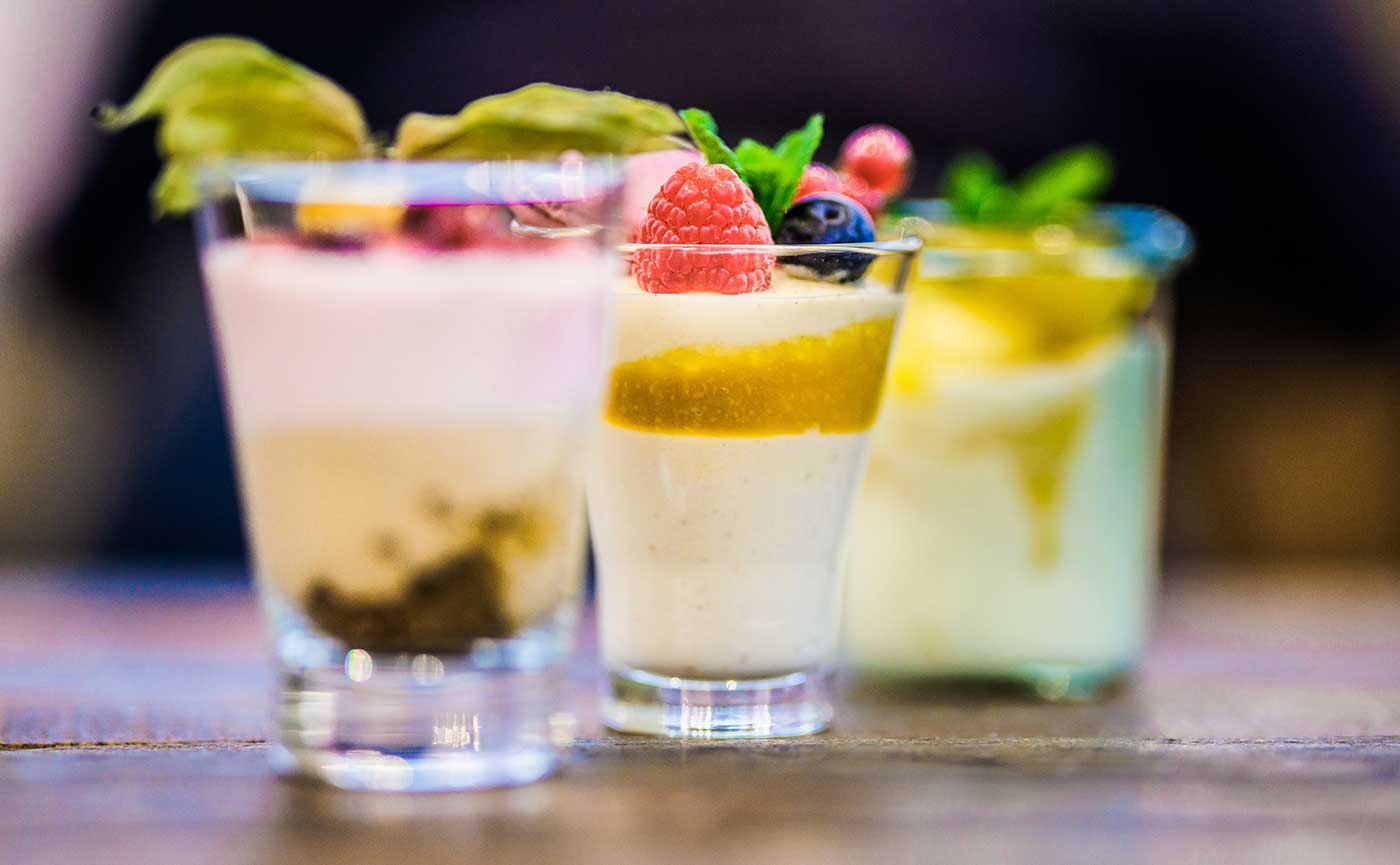 Verschiedenste Dessertvariationen werden mit natürlichen Zutaten und täglich frisch zubereitet. Die Hingabe und Liebe zum Detail sowie die Auswahl feinster Rohprodukte lassen jede Dessertkreation zu einem optischen Feuerwerk werden. Mousse au Chocolat aus geschmolzener Belgischer Edelschokolade und frischer Sahne, erfrischende Fruchtdesserts aus frisch püriertem Obst und Fruchtmark, intensiver Vanillegeschmack und hier und da ein Hauch von Tonkabohnen. Ob Gin Tonic Gelee, Crème brûlée oder aber ein raffiniertes Schwarzwälder Parfait – der Patissiermeister nimmt jeden Kundenwunsch ernst und lässt kleine Kunstwerke entstehen.