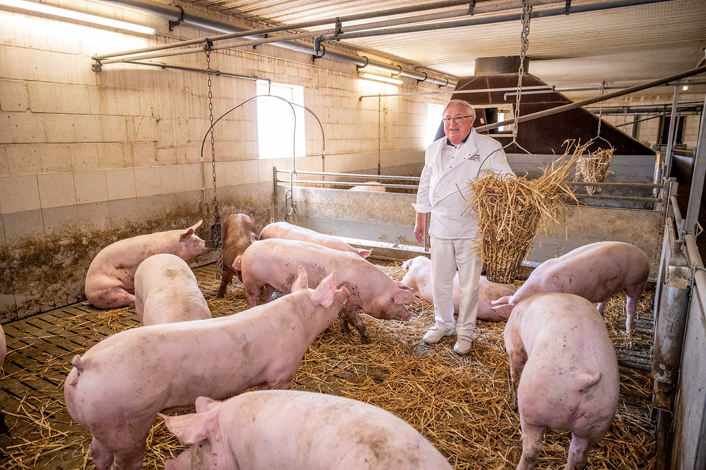 Auch die Schweine bezieht Stolzenhoff aus der Region. Es handelt sich dabei um „Strohschweine“, die artgerechter auf weichem Stroh statt auf harten Spaltenböden gehalten werden und mehr Platz, Zugang zu frischer Luft und Auslauf haben. Dies führt zu besserer Gesundheit, mehr Wohlbefinden und besonders zartem, saftigem Fleisch. Sie stammen von den Bauern Schürmann aus Hamm und Bauer Hesseler aus Selm.